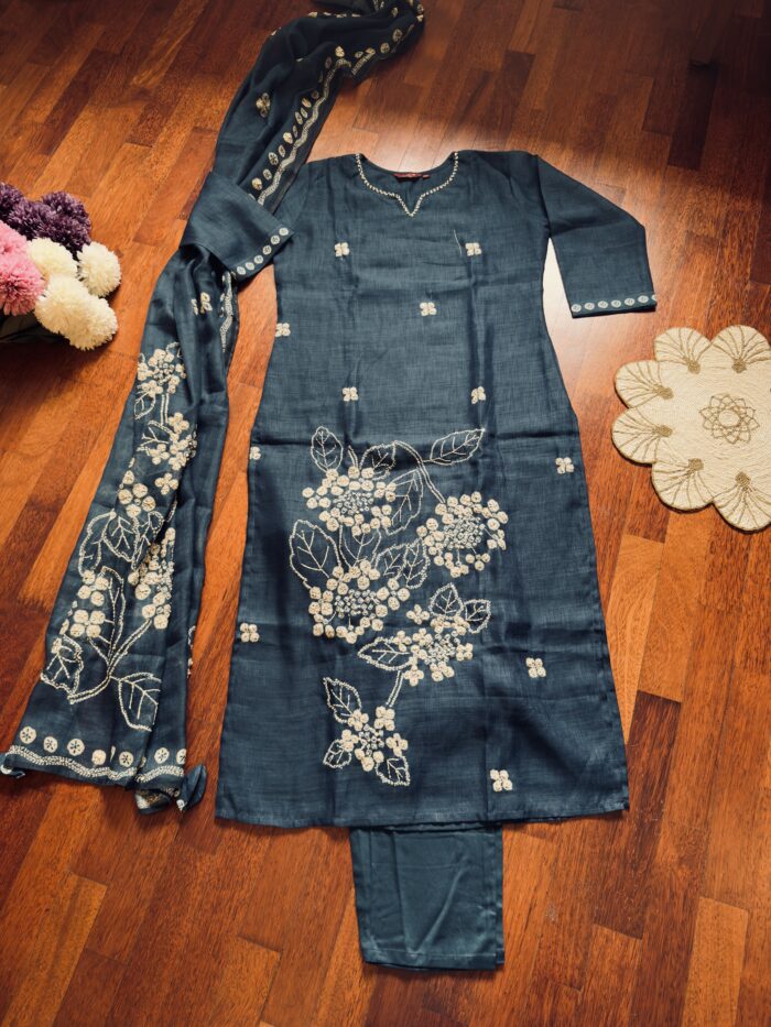 A classic Navy Blue Pure Linen Straight cut Kurta Set with elegant white floral french knot embroidery, paired with a blue linen Dupatta with matching embroidery. Finished with a straight-cut pant in matching navy, this set is the perfect balance of comfort and timeless style.