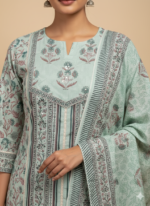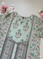 A refreshing sea green cotton kurta set featuring an elegant block-printed panel design with soft floral motifs. Crafted in breathable cotton, this set is designed for all-day comfort with delicate detailing and a calm, understated charm.