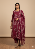 An elegant dark maroon cotton kurta set featuring exquisite block-printed deer motifs, designed for comfort with an artisanal touch. Soft, breathable, and visually rich, this exclusive piece is perfect for effortless everyday styling.